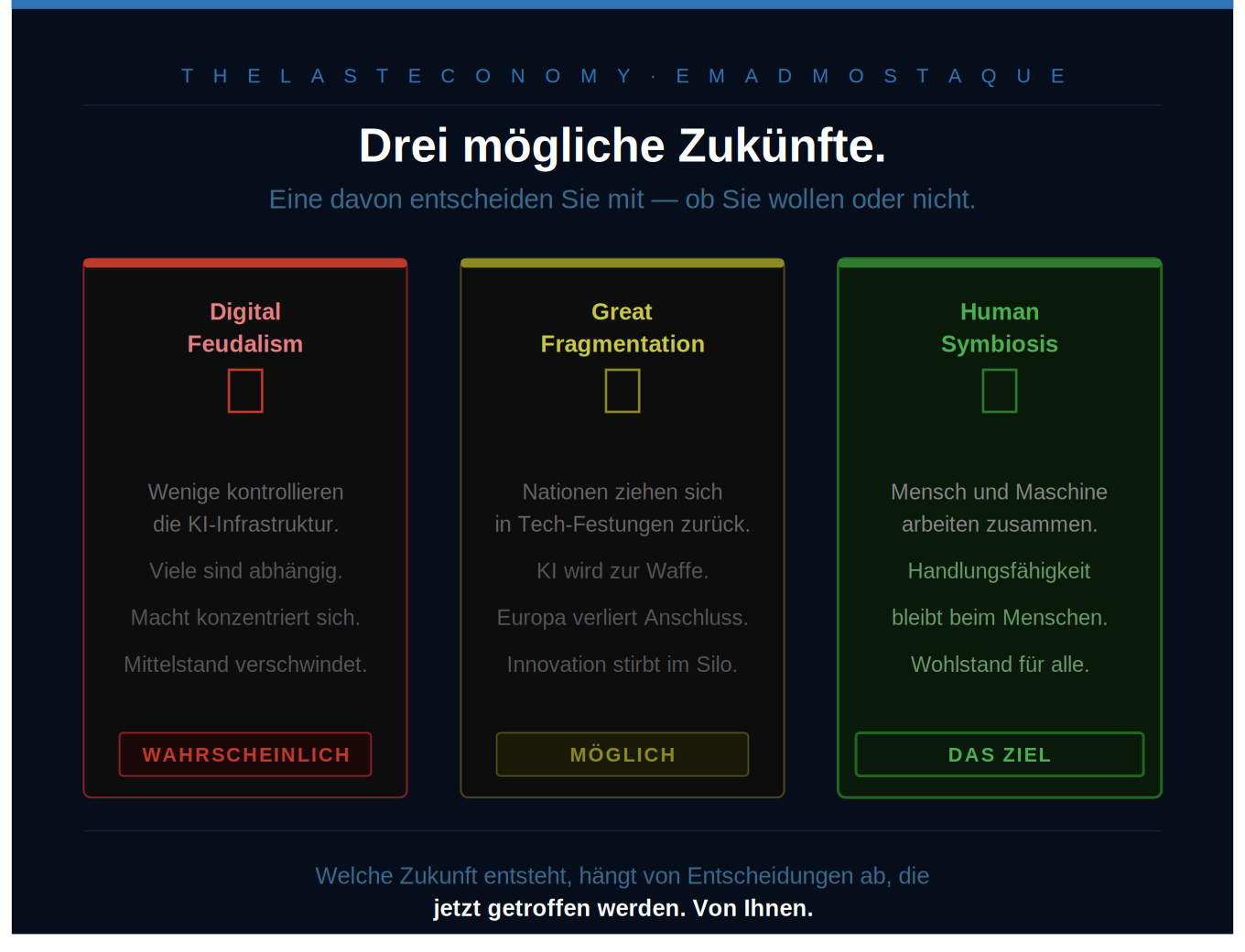 Das bedeutet nicht das Ende menschlicher Arbeit. Es bedeutet das Ende der menschlichen Arbeit als primärer Engpass wirtschaftlicher Produktion. Die knappe Ressource der Zukunft lautet: